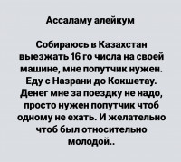 Собираюсь в Казахстан выезжать 16 го числа на своей машине, мне попутчик нужен. Еду с Назрани до Кокшетау. Денег мне за поездку не надо, просто нужен попутчик чтоб одному не ехать. И желательно чтоб был относительно молодой. 89280950150 Ислам Или в директ @islamjan.0615