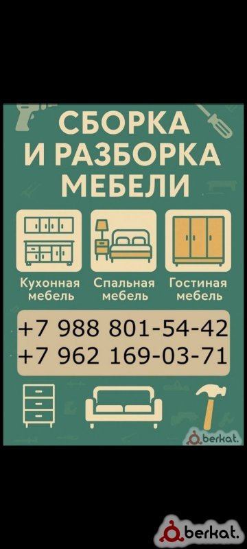 Услуги: — Сборка новой мебели ( кухни, шкафы, столы и др.). — Ремонт: замена фурнитуры, петель, ручек; укрепление конструкций, починка ящиков/дверей. ? Преимущества: • Работаю быстро и аккуратно. • Гарантия на все виды работ. • Доступные цены (договорные, прайс по запросу). ? Примеры работ и отзывы — предоставлю по запросу! ? Звоните/пишите: Телефон: +7(988)1297778 +7 988 801-54-42 WhatsApp:+7(962)1690371 ? Работаем без выходных! Сроки: • Сборка — от 2 часов (в зависимости от сложности). • Ремонт — в течение дня