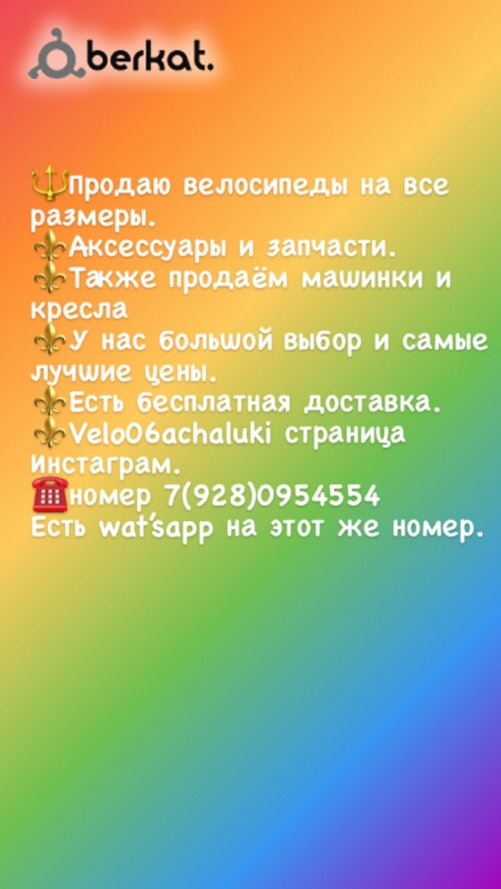 ⚜️Продаю велосипеды на все возраста; ⚜️Также аксессуары и запчасти; ⚜️Продаю машинки и кресла; ⚜️Есть бесплатная доставка. ☎️Номер 7(928)0954554 также есть wat’sapp на этот же номер. Ссылка на инстаграм https://instagram.com/velo06achaluki?r=nametag