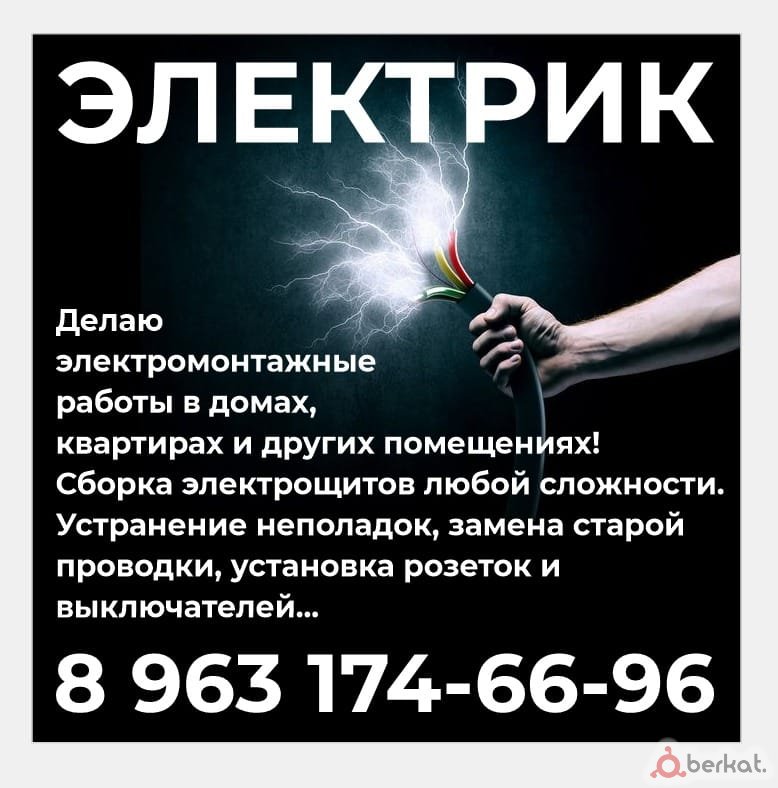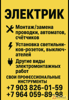 Делаю электромонтажные работы в домах, квартирах и других помещениях!Сборка электрощитов любой сложности. Устранение неполадок, замена старой проводки, установка розеток и выключателей...