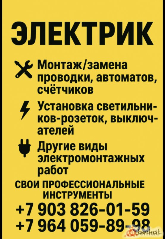 Электрик — любые сложности! ⚡ ✅ Свои профессиональные инструменты ✅ Гарантия на выполненные работы ✅ Честные цены, без накруток ✅ Ответственный и аккуратный подход Что делаю: ✅ Замена и ремонт проводки (квартиры, дома, офисы) ✅ Установка розеток, выключателей, светильников ✅ Быстро найду и устраню любые неполадки (нет света, выбивает автомат, греется проводка) ✅ Сборка и подключение электрощитов «под ключ»